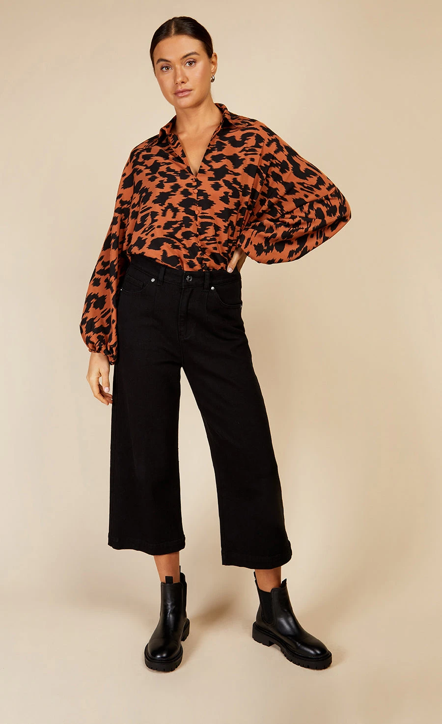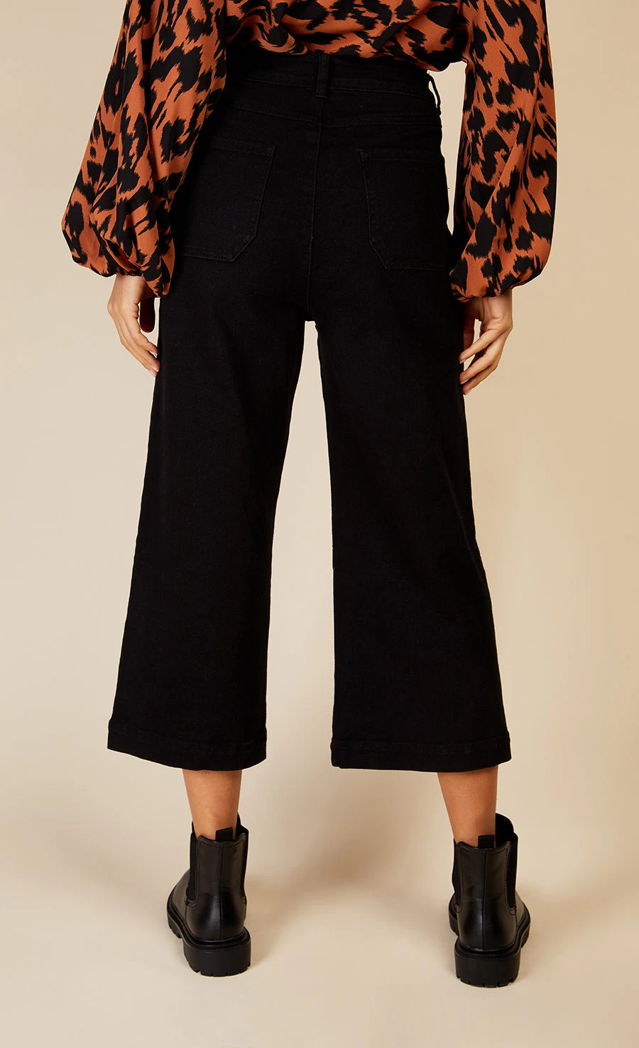 Low-rise, wide leg black denim jeans. Ultra-relaxed fit, cropped length with a subtle kickflare.