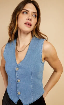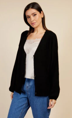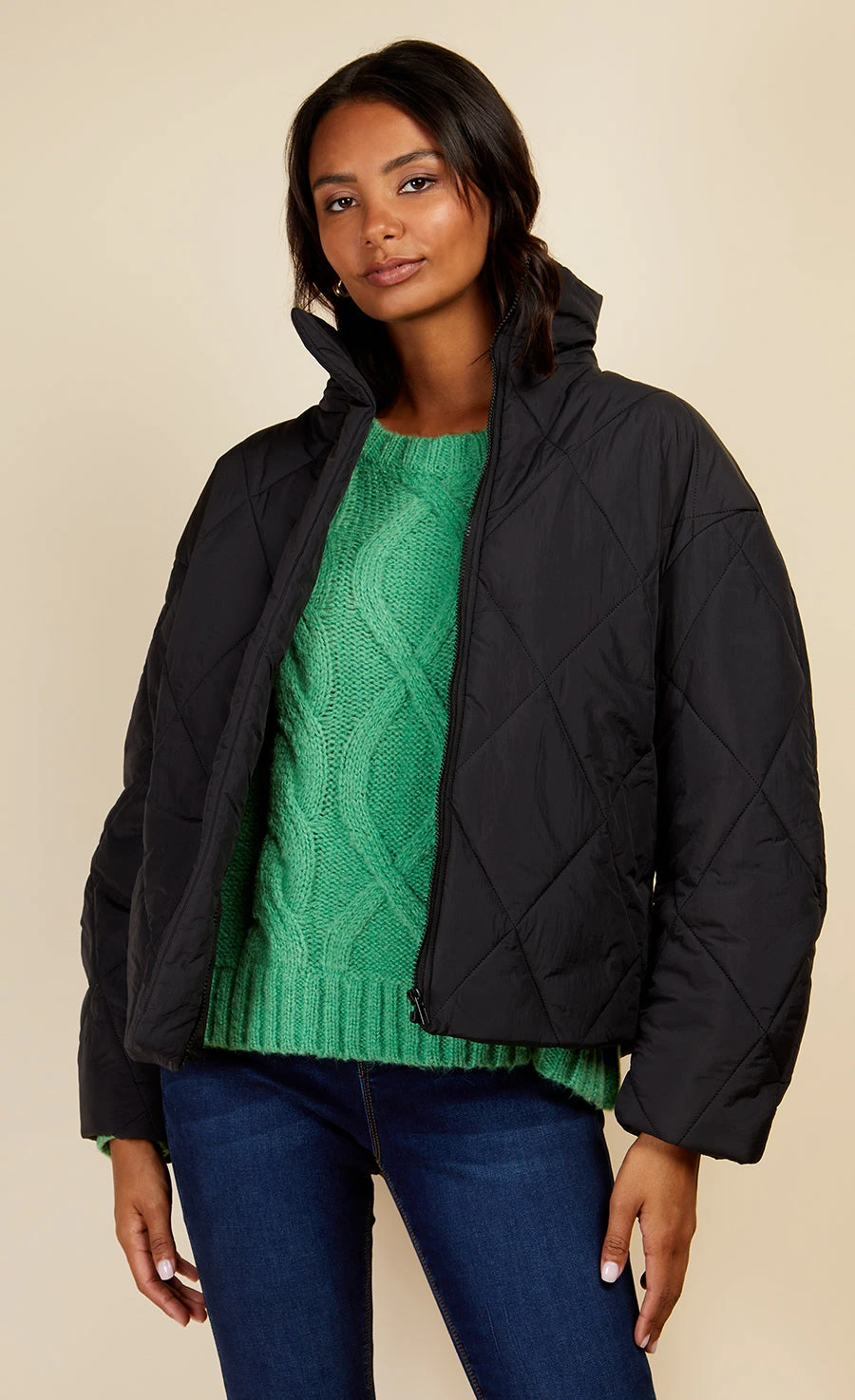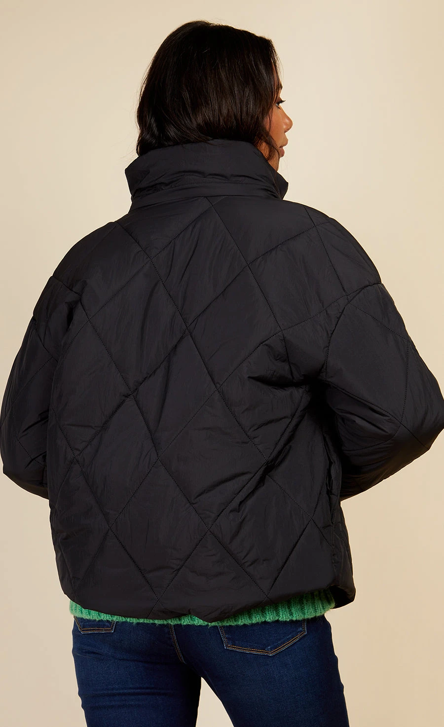 Short black puffer jacket, with criss cross stitch detailing, high collar and concealed zip and popper closure.