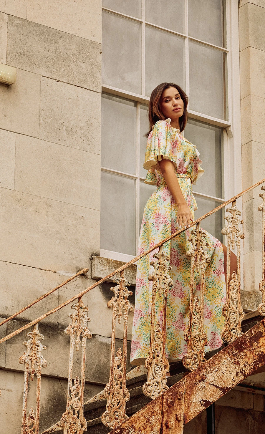 Fluid satin fabric, floaty angel sleeves and a gorgeous frill trim make this maxi feel ultra-feminine. Cut to flatter with a wrap front and tie waist. Print placement may vary.