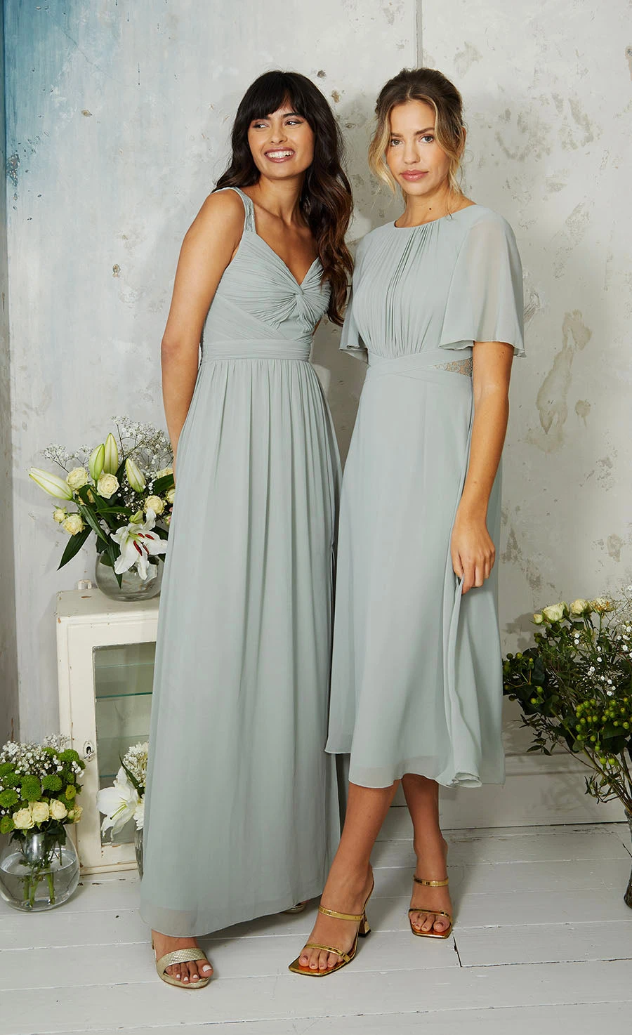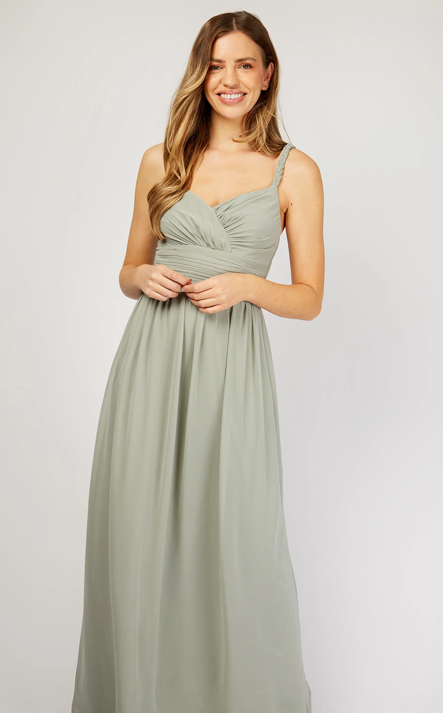 Our Grecian-inspired soft sage gown is a simple yet striking choice for bridesmaids or those looking for something elegant for a special event. We love the braided straps, the emphasis on the waist and the long, flowing full-length skirt.