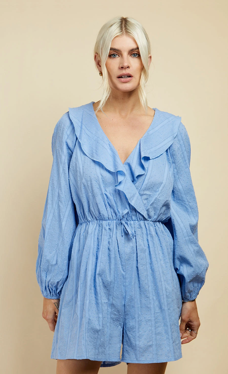 Free-spirited and flirty, this breezy mini will become your summer staple. Crafted from textured dobby fabric in a gorgeous shade of cornflower blue, it’s cut to flatter with a mock wrap bust and drawstring waist. Floaty blouson sleeves and frill edge details dial up the boho vibe – just add sandals and gold hoops.Â