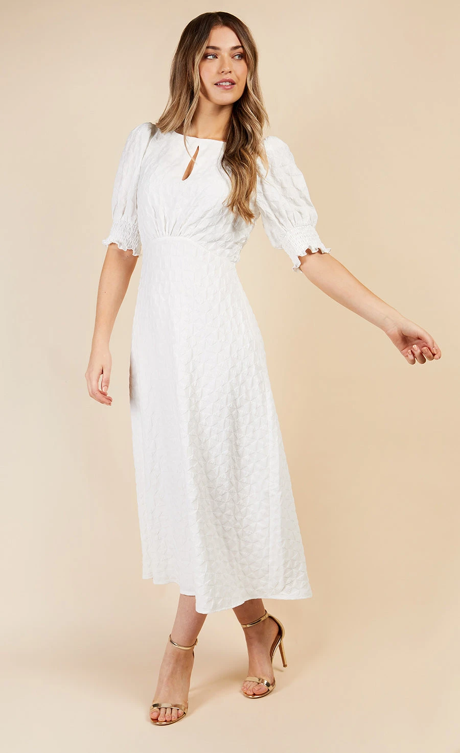 Crafted in a gorgeous lightweight textured fabric, this little white dress is nothing short of angelic. Cut in a flattering empire line, featuring keyhole neck detail and ultra-feminine puff sleeves. This one is guaranteed to be your Spring time go-to!
