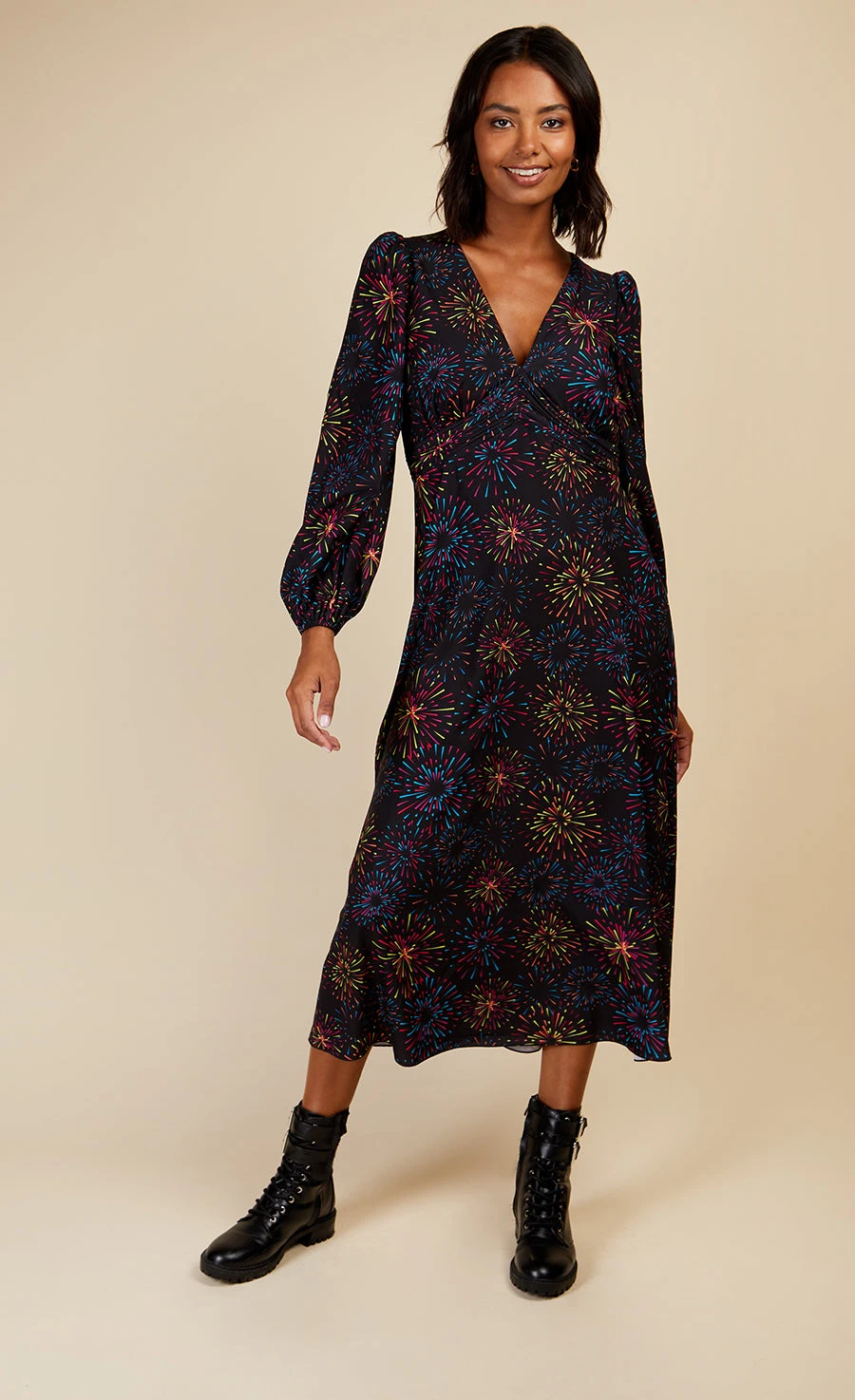 The throw-on-and-go midaxi. Crafted from a slinky satin fabric with fluid hemline, featuring, a plunging V-neck, blouson sleeves and all-over firework print. Style with boots and a teddy coat by day or heels and a leather-look jacket by night. Print placement may vary.