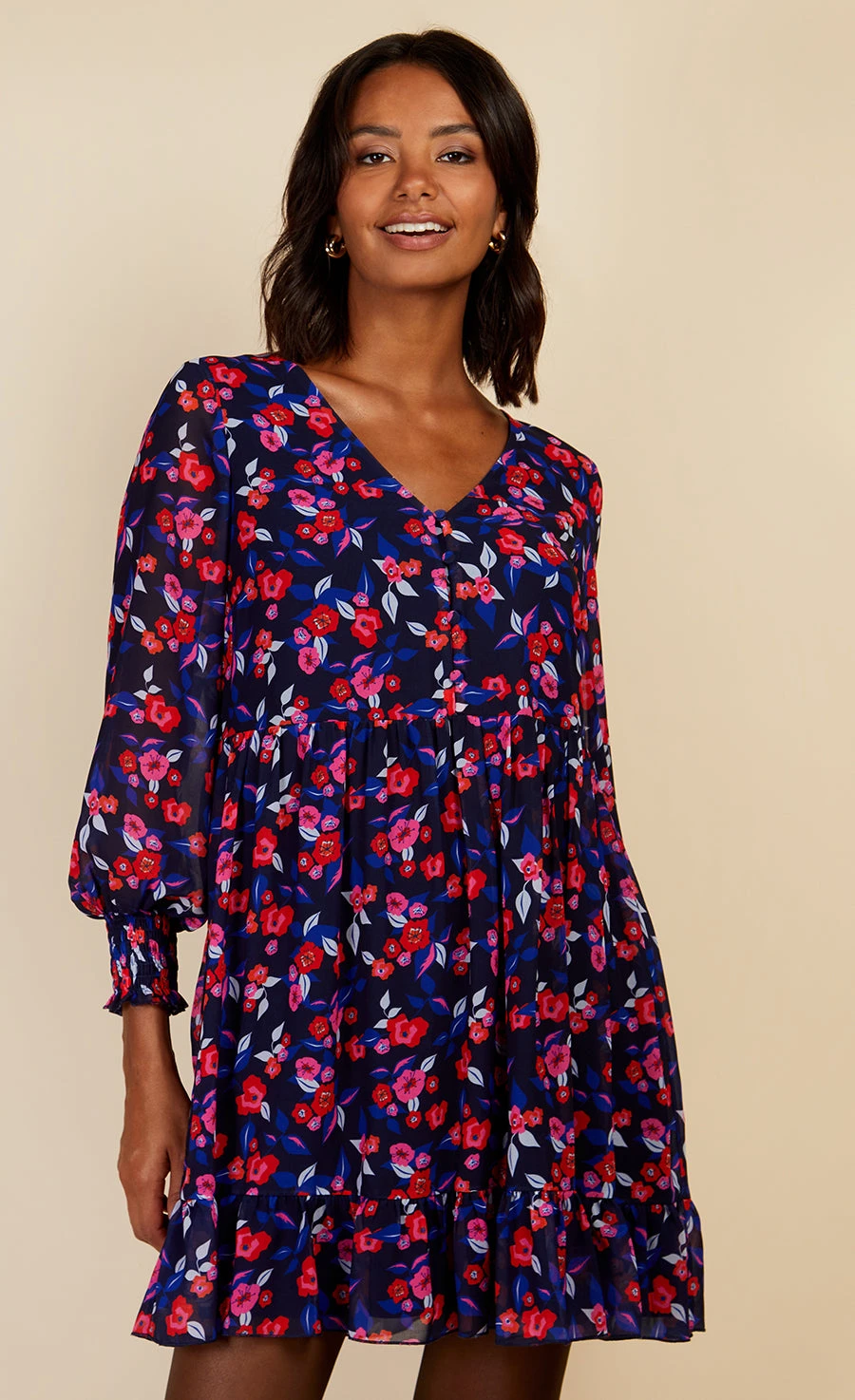 Bold floral print adds an on-trend twist to the tiered smock dress in this timeless wardrobe staple. An empire waistline and tiered ruffle hem promise to give a feminine flair to your Winter wardrobe. Style with biker boots and a PU jacket. Print placement may vary.