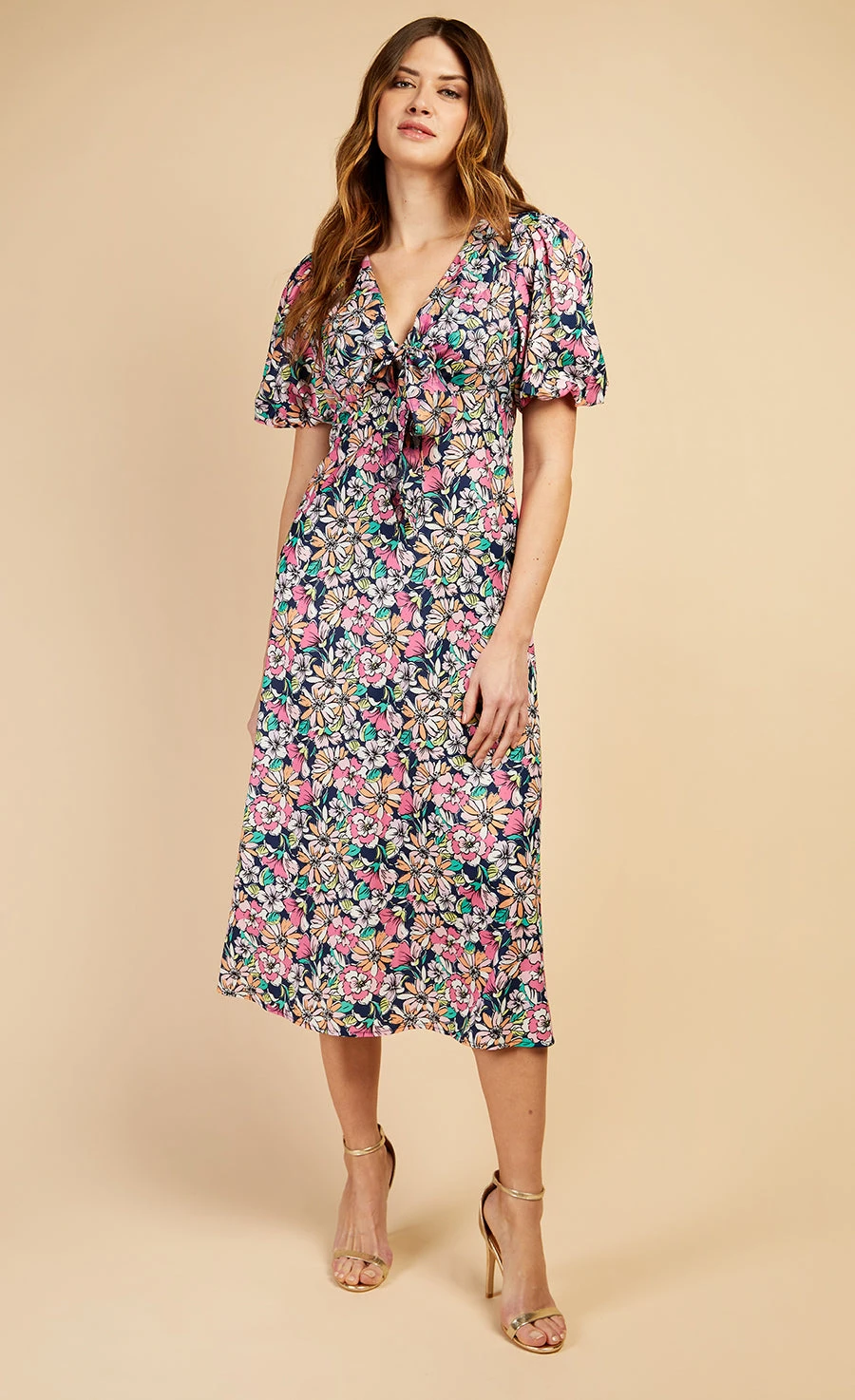 Adorned in a captivating floral print, this dress boasts an effortlessly flattering a-line silhouette and tie-front detail at bust. Perfect for any Springtime occasion, the floral pattern adds a touch of whimsy to your wardrobe. Style with a barely there heel and statement sunnies!