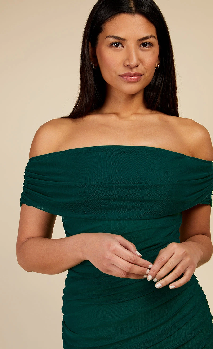 Cut to hug your curves, ruched mesh fabric creates an instant hourglass in this bardot midi, the most flattering of silhouettes awaits – simply add a clutch and strappy heels.
