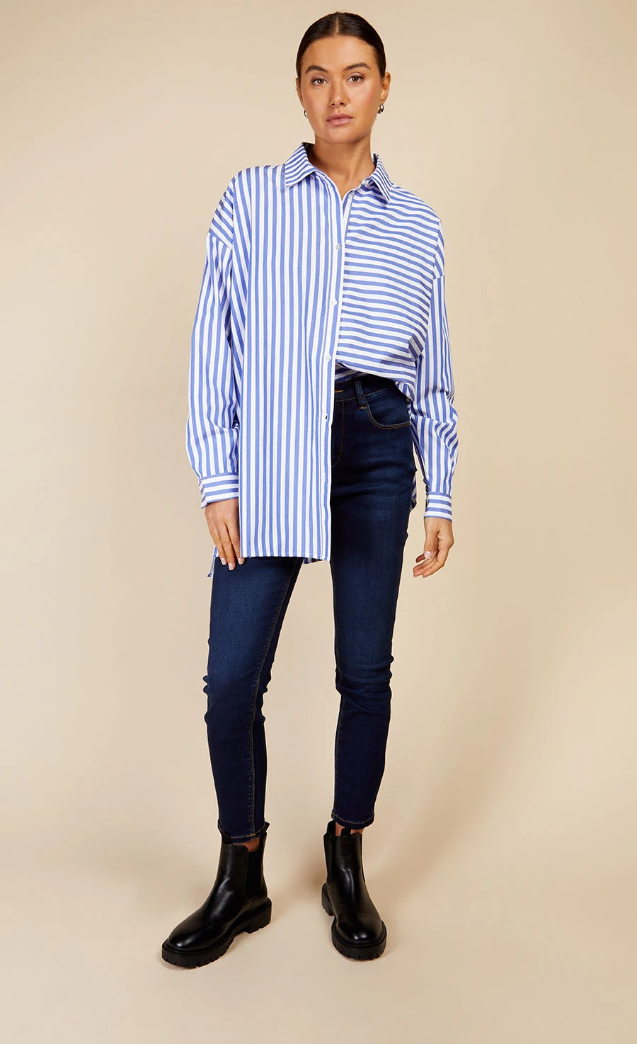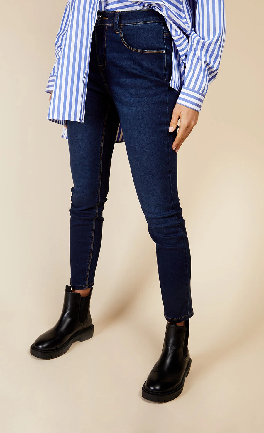Blue denim skinny jeans in a washed stretch denim with high waist zip fly and slim legs.