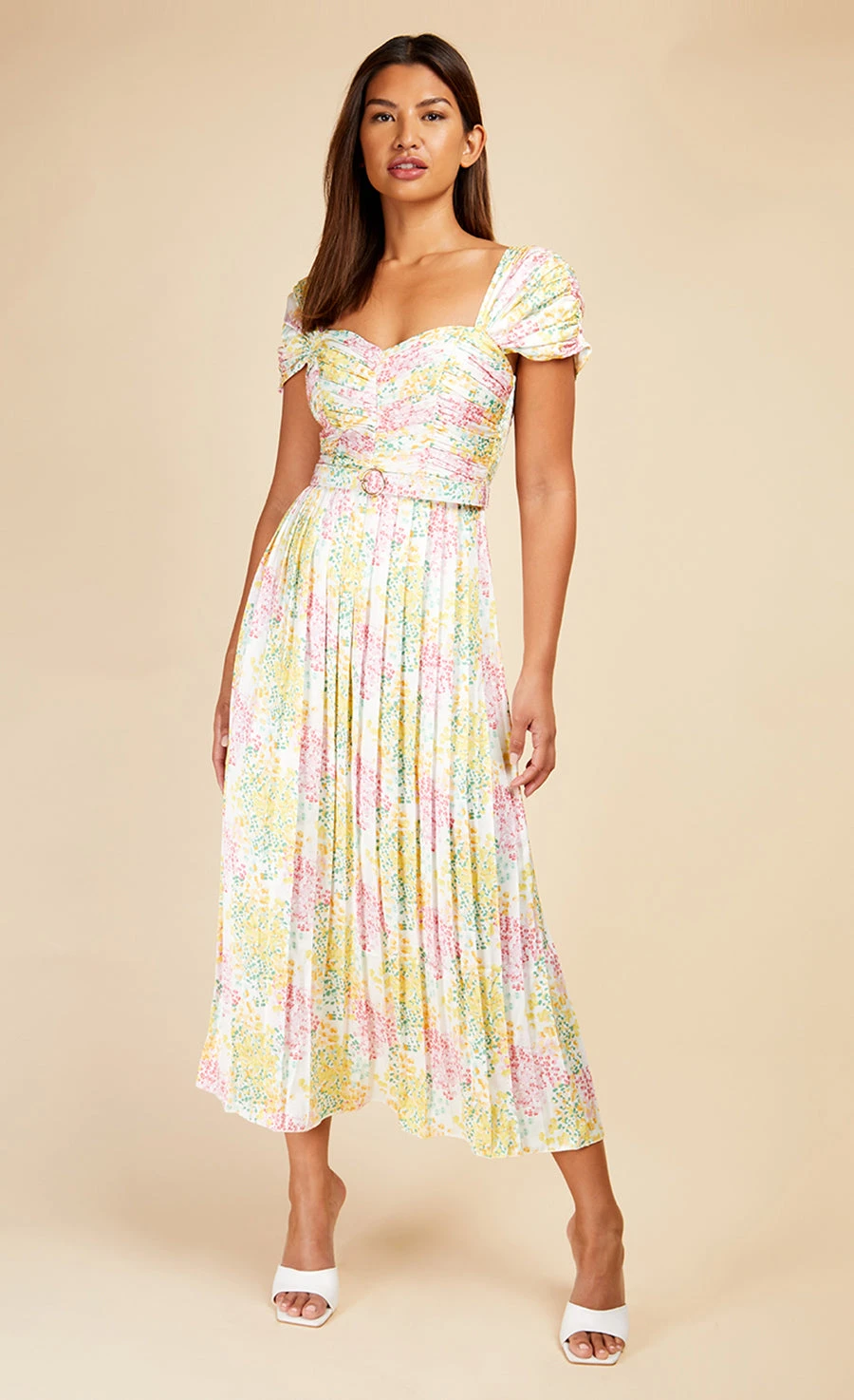 We don’t know what we love more about this midi – the mood-boosting floral print, the made-to-flatter belted waist or the dreamy sweetheart neckline and gathered sleeves combo. Not forgetting the slinky satin fabric and pleated hem. Perfection. Print placement may vary.