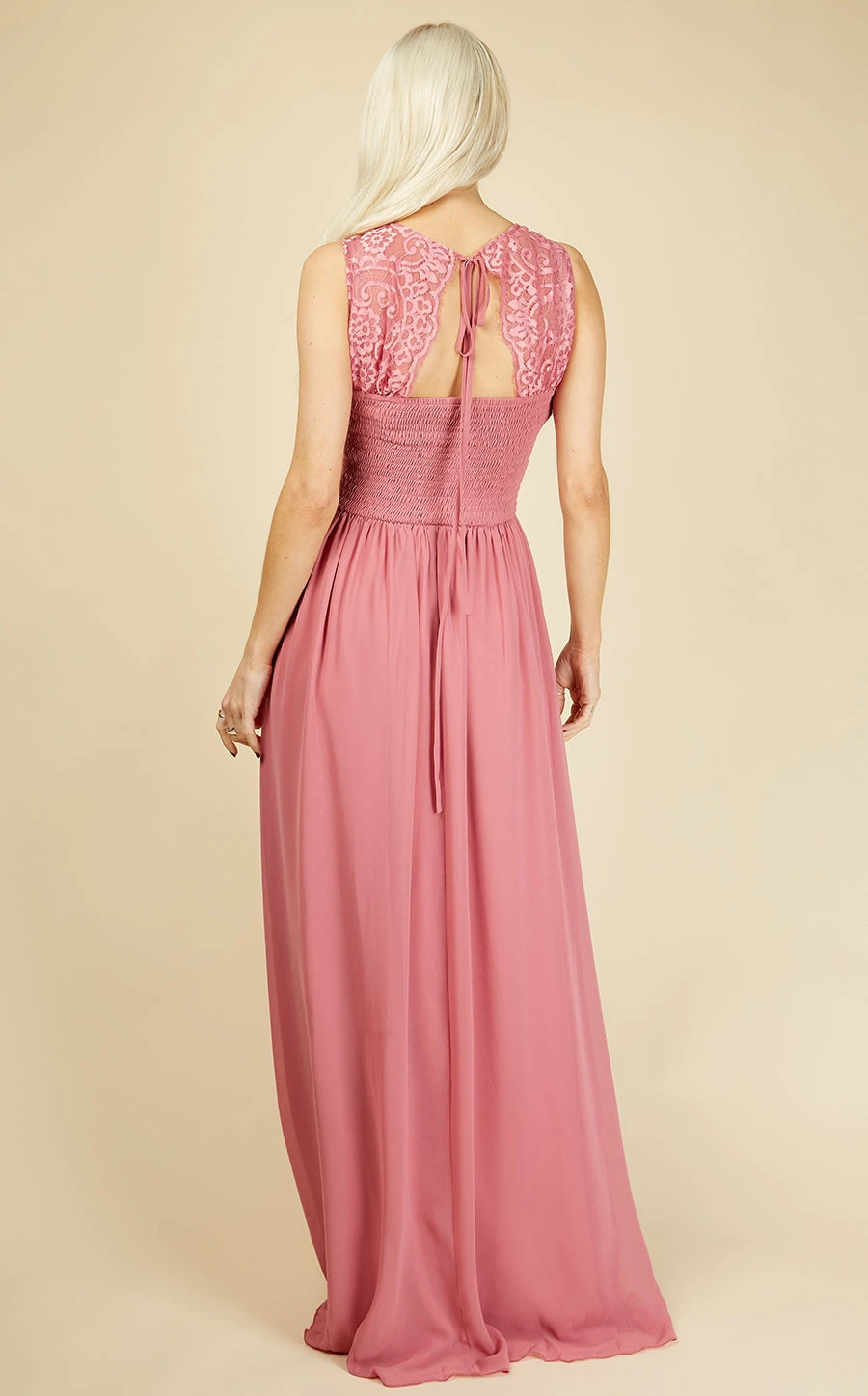 Our Grecian-inspired rose pink gown is a simple yet striking choice for bridesmaids or those looking for something elegant for a special event. We love the ruched front, tie detail back, cinched waist and the long, flowing full-length skirt.