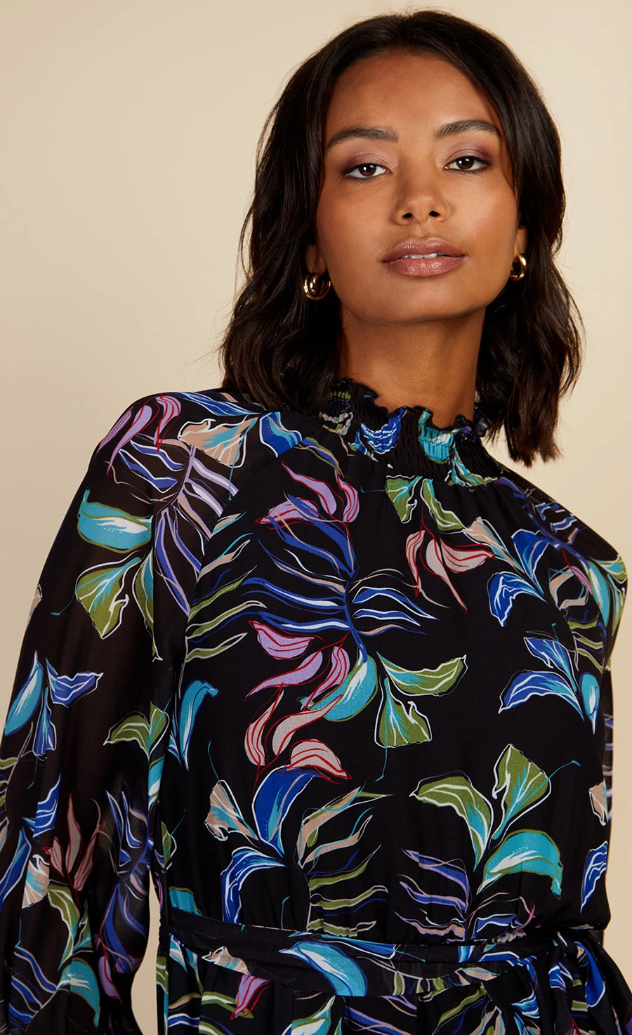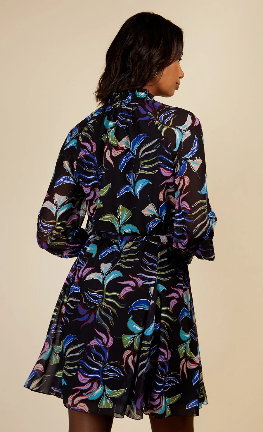 Cold weather florals are trending and this chiffon mini is ticking all of the boxes. Designed to fit and flare with a self-tie belt and featuring a high neck and sheer sleeves. Style with a block heel ankle boot and oversized coat. Print placement may vary.