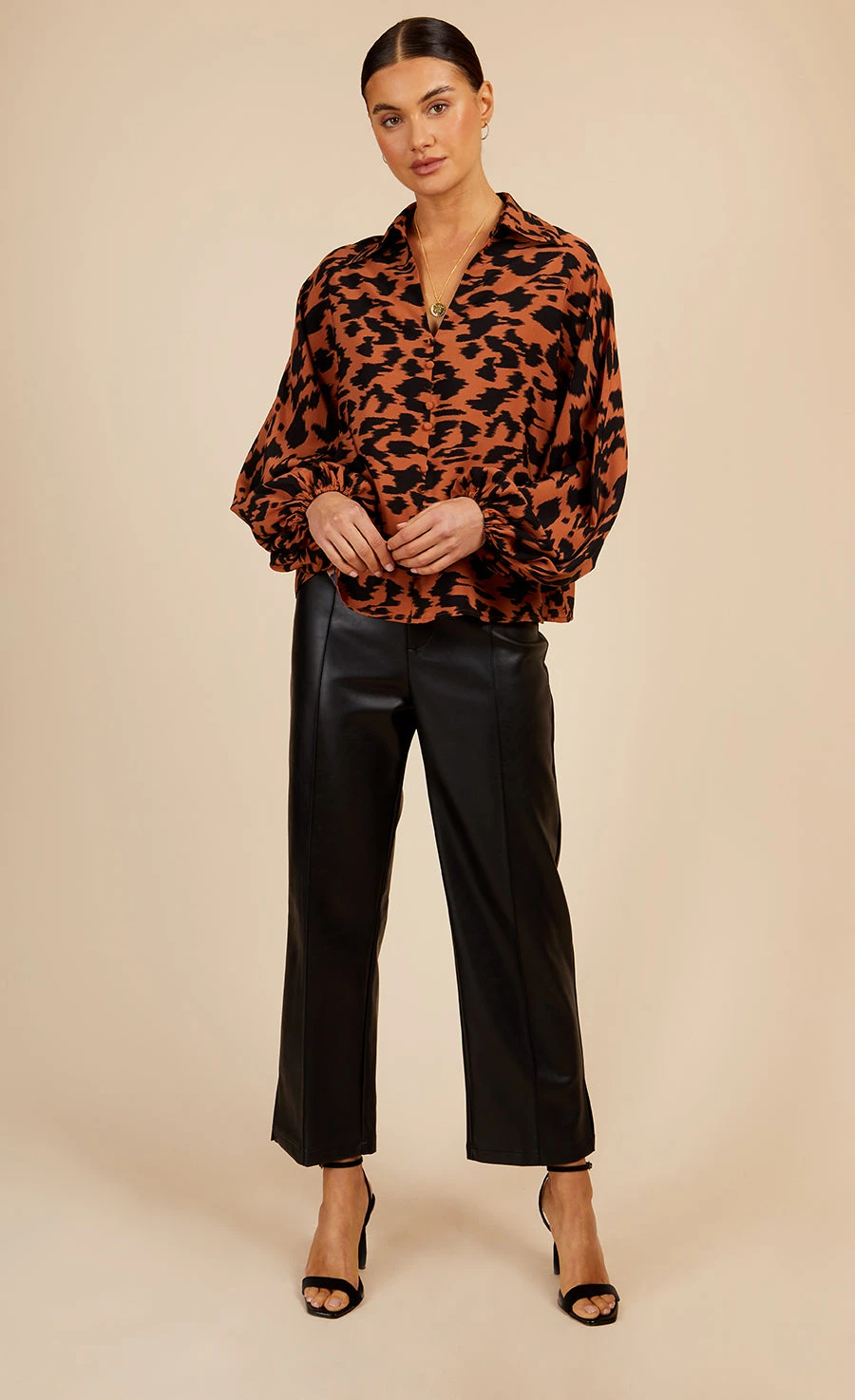 Relaxed fit shirt in a leopard print chiffon with elasticated cuff balloon sleeves, wide collar and functional summarys down the front. Print placement may vary.