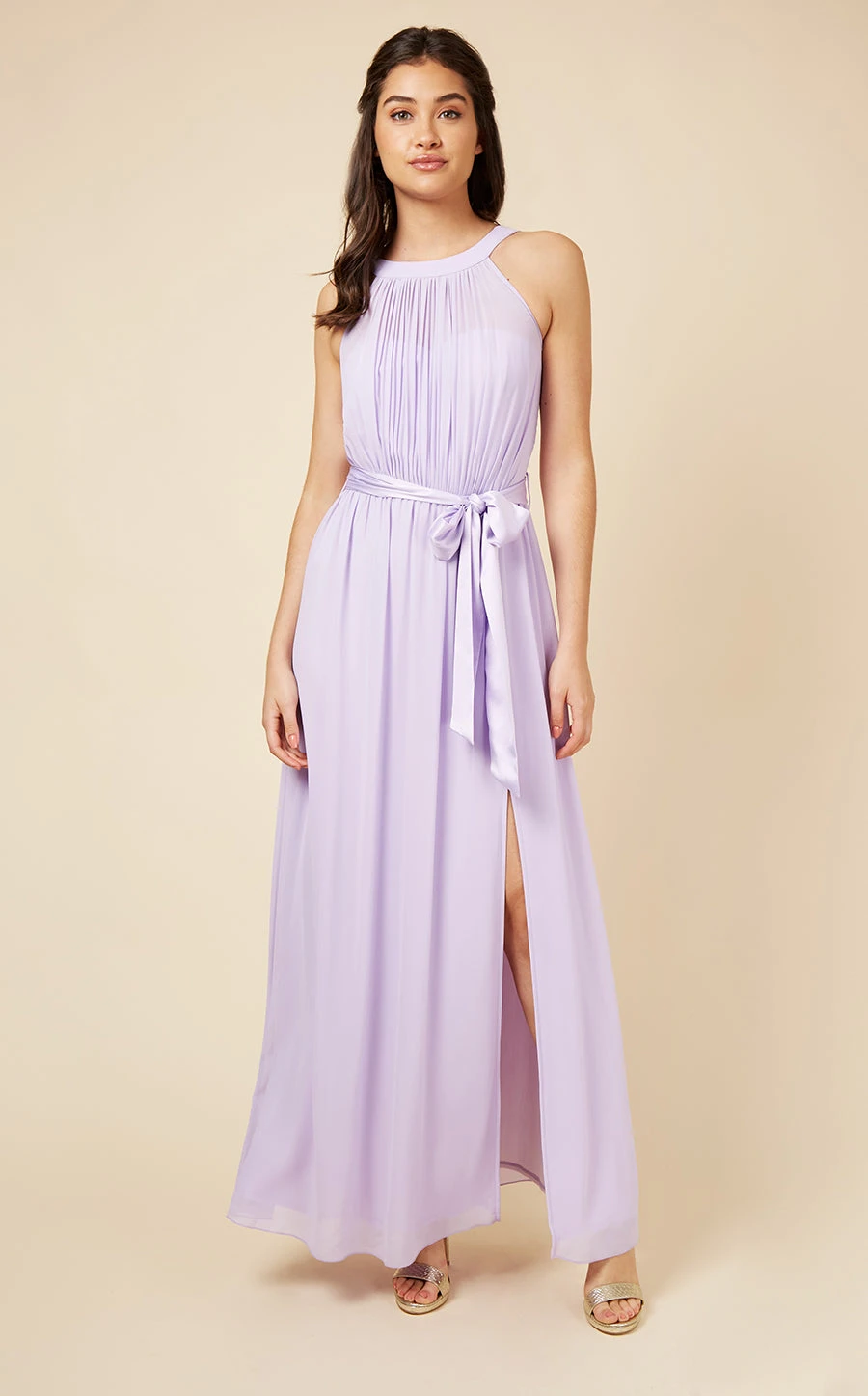 Our lavender halterneck dress features a gathered high neck, waist-enhancing satin sash and elegant thigh split. There’s a sweetheart neckline hiding behind the chiffon too – sure to make you feel absolutely gorgeous.