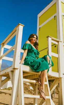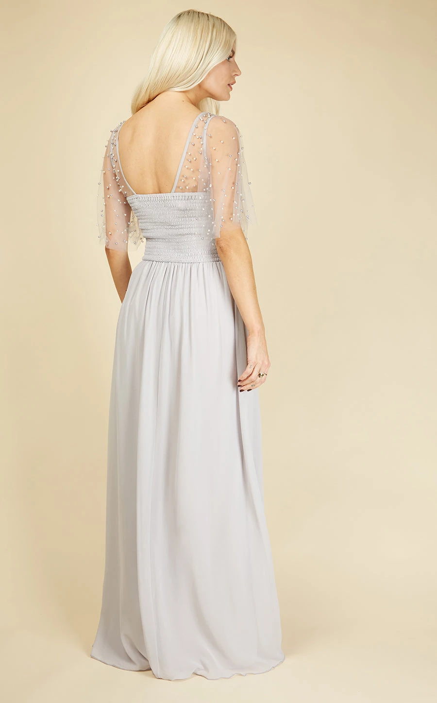 With floaty angel sleeves, a flattering V-neckline and cross over waist, this romantic gown is a stunning bridesmaid option. The chic grey shade looks gorgeous with silver accessories.