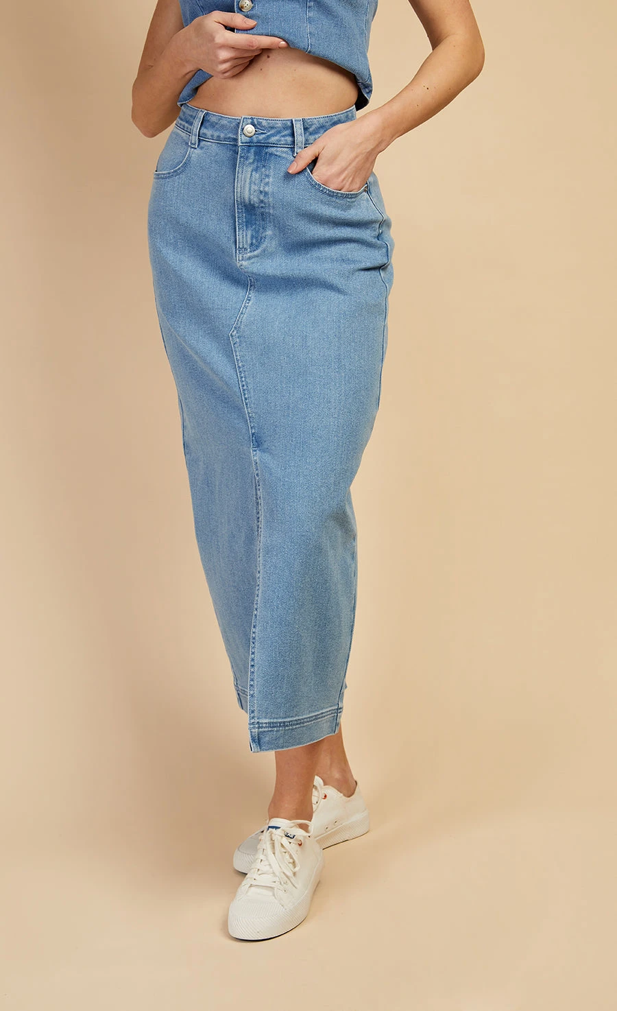 A wardrobe staple, redefined. Embrace timeless sophistication with this versatile piece, blending the classic appeal of denim with a pencil silhouette which flatters your curves, creating a sleek and modern look for any occasion. Style with a lightweight knit by day and dress up with a sleek bodysuit by night.