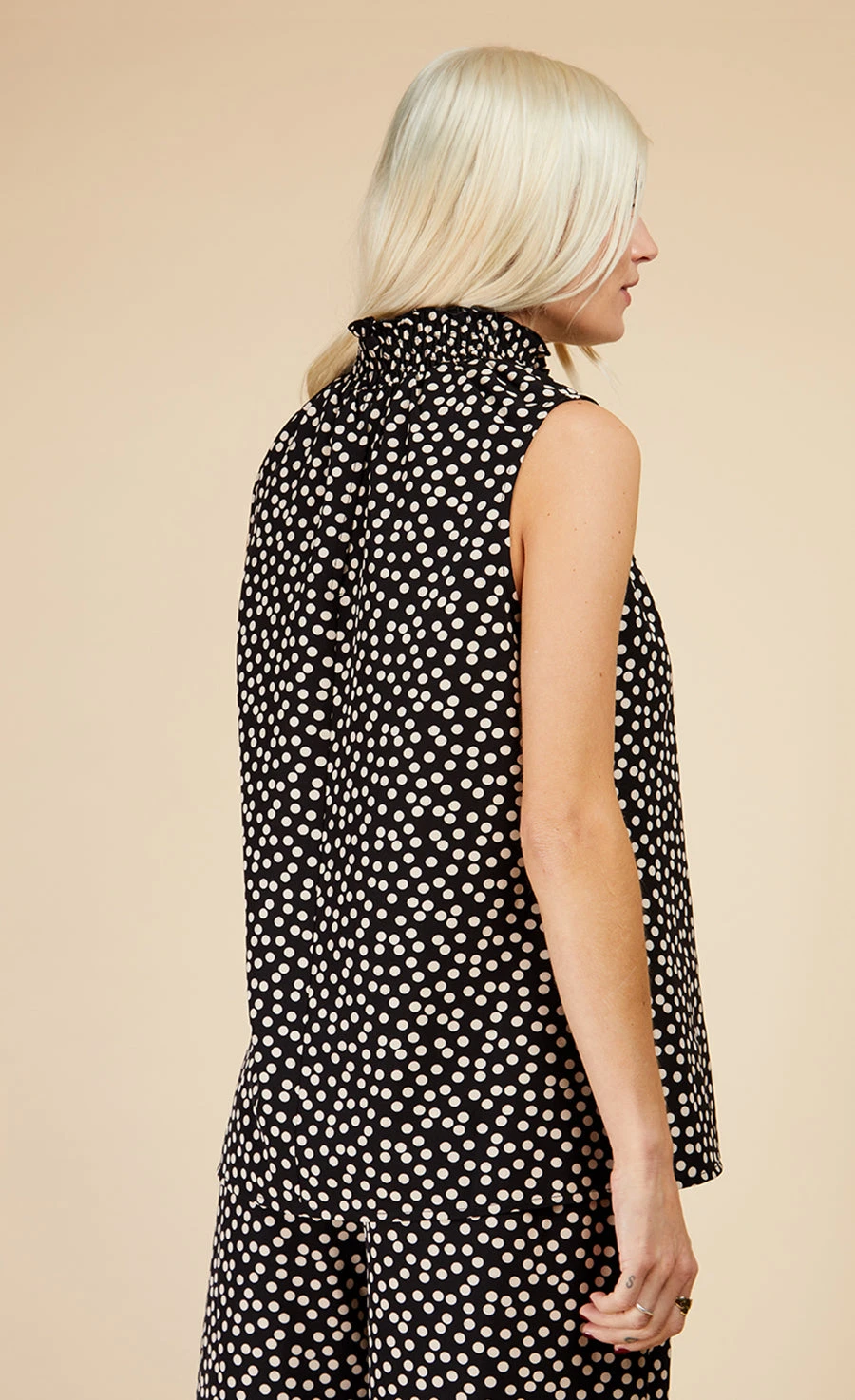 Introducing the newest recruit to your nice top gang. This one’s framed with a very chic shirred high neck and cut in a comfy A-line silhouette. For a final feminine flourish, we’ve added a cute frilled hem. Style with the matching trousers for maximum impact. Print placement may vary.
