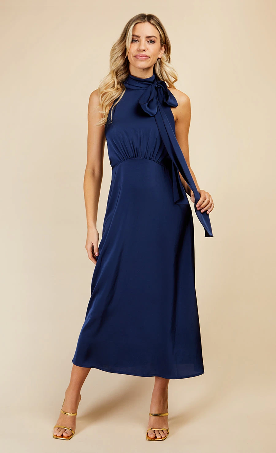 Sophisticated, sexy and totally show-stopping, this slinky satin midaxi will be your special occasion MVP. Topped with an ultra-chic bow detail high neck, it’s cut to gently nip in your middle before falling into a swishy bias cut hem that’s made for a spin on the dance floor.Â
