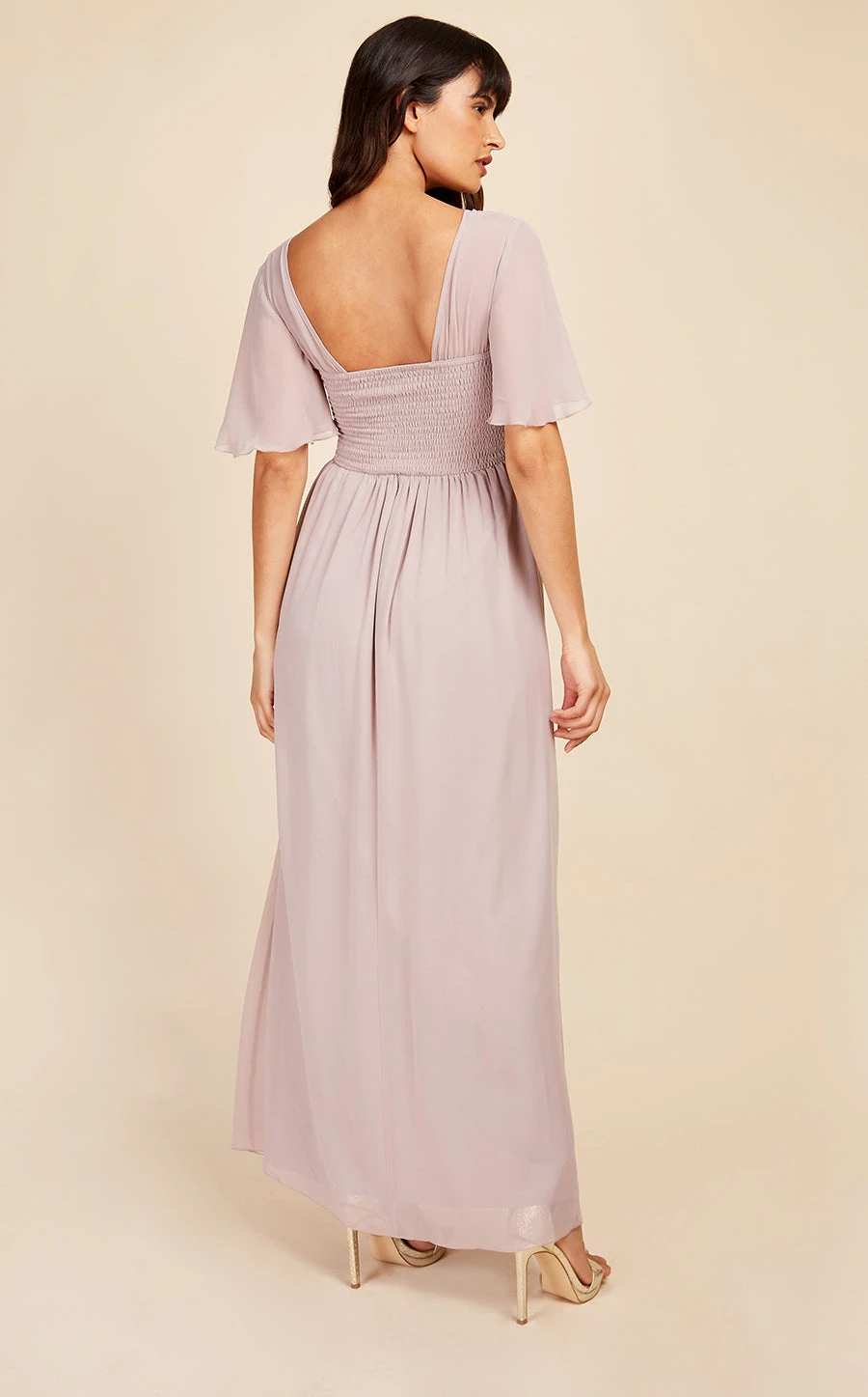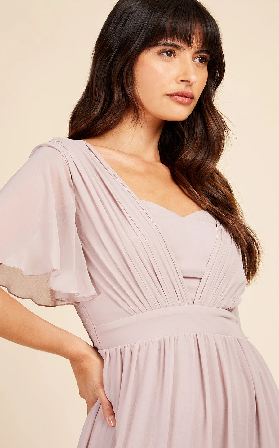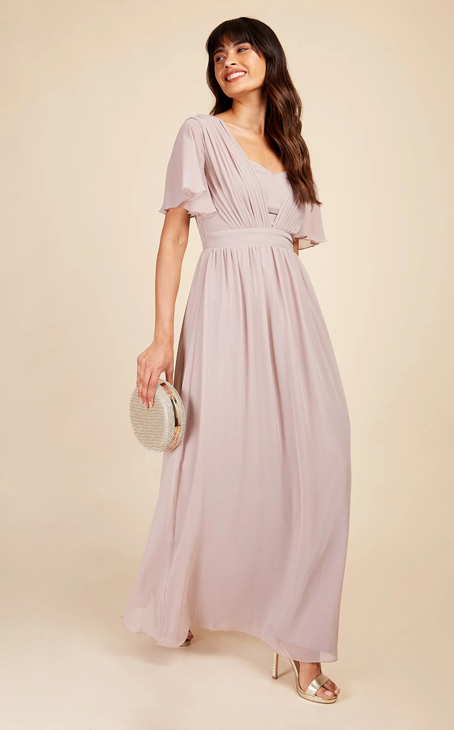 In a sophisticated shade of mink, this gorgeous gown is the perfect choice for any bridesmaid. Crafted from delicate chiffon, it features beautiful angel sleeves and a satin sash at the waist for flattering fit. Your maids will love it.Â