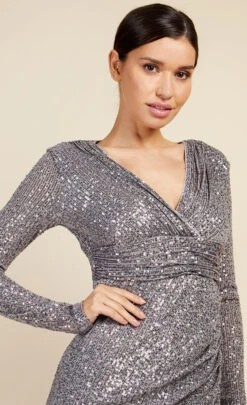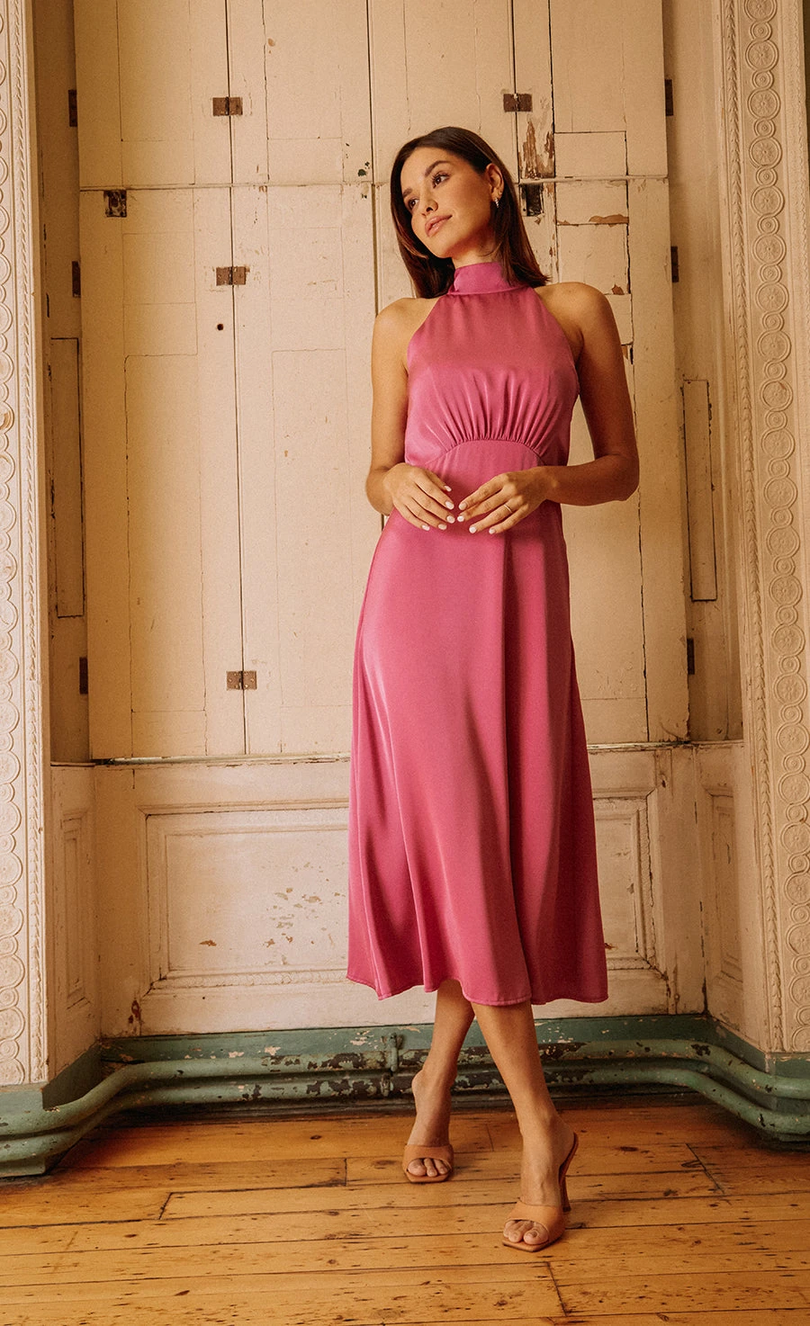 The slinky satin midaxi, topped with an ultra-chic bow detail high neck, cut to gently nip in your middle before falling into a bias-cut hem. Button up closure at neckline.