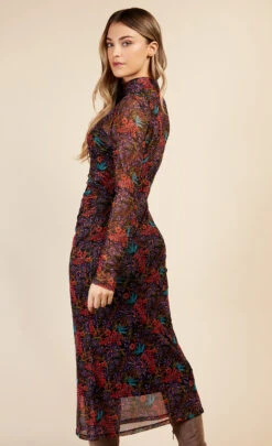A heavenly navy chiffon gown that is perfect for bridesmaids and swish special events. We love the soft, draping sleeves that elegantly hang off the shoulders, the gathered bust detail.