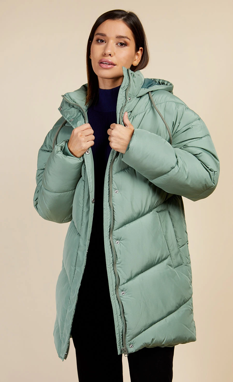 Sage puffer jacket, oversized with diagonal detailing and drawstring hood. With concealed zip and popper closure.