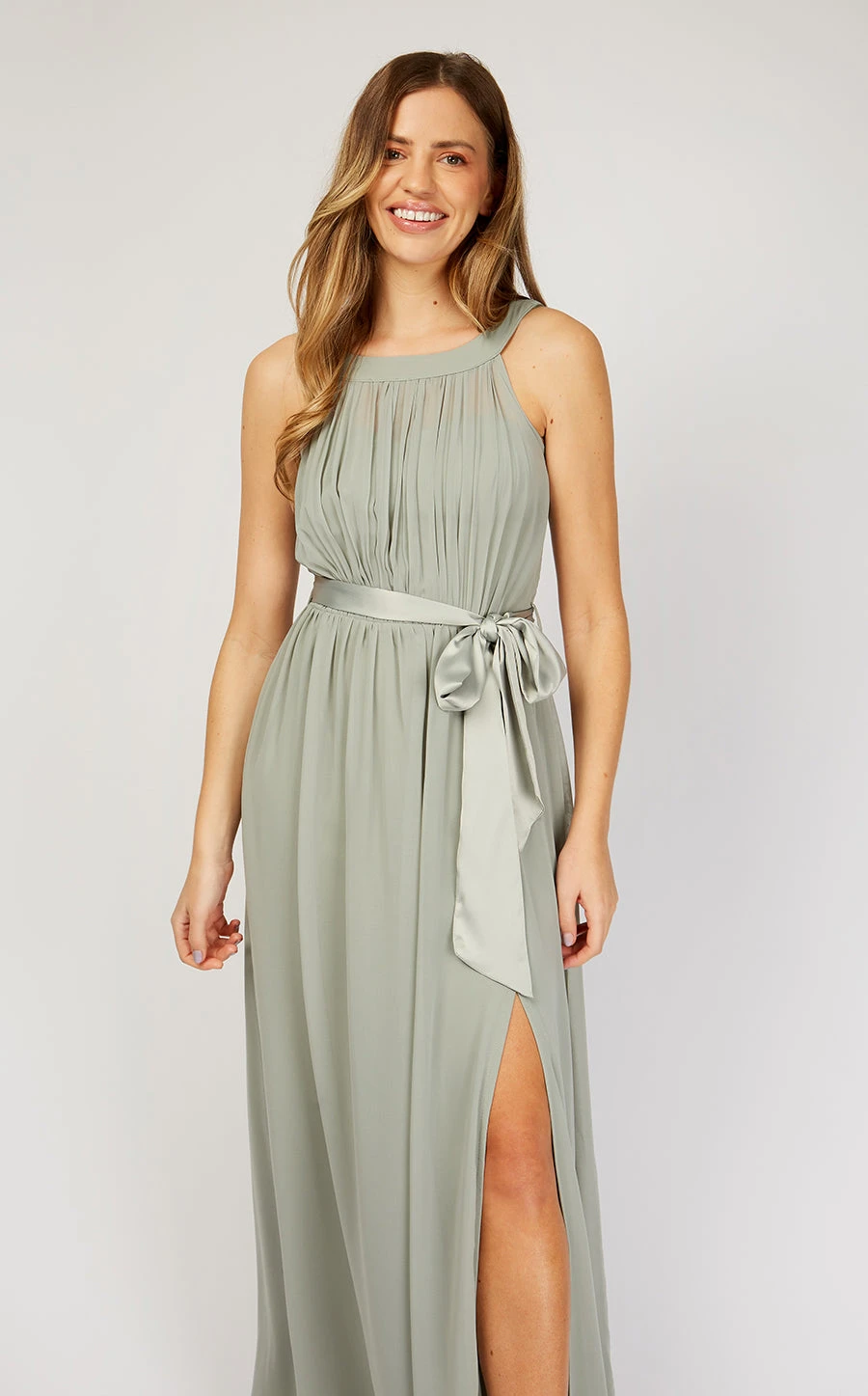 Our sage green bridesmaid dress features a gathered high neck, waist-enhancing satin sash and elegant thigh split. There’s a sweetheart neckline hiding behind the chiffon too – sure to make you feel absolutely gorgeous.