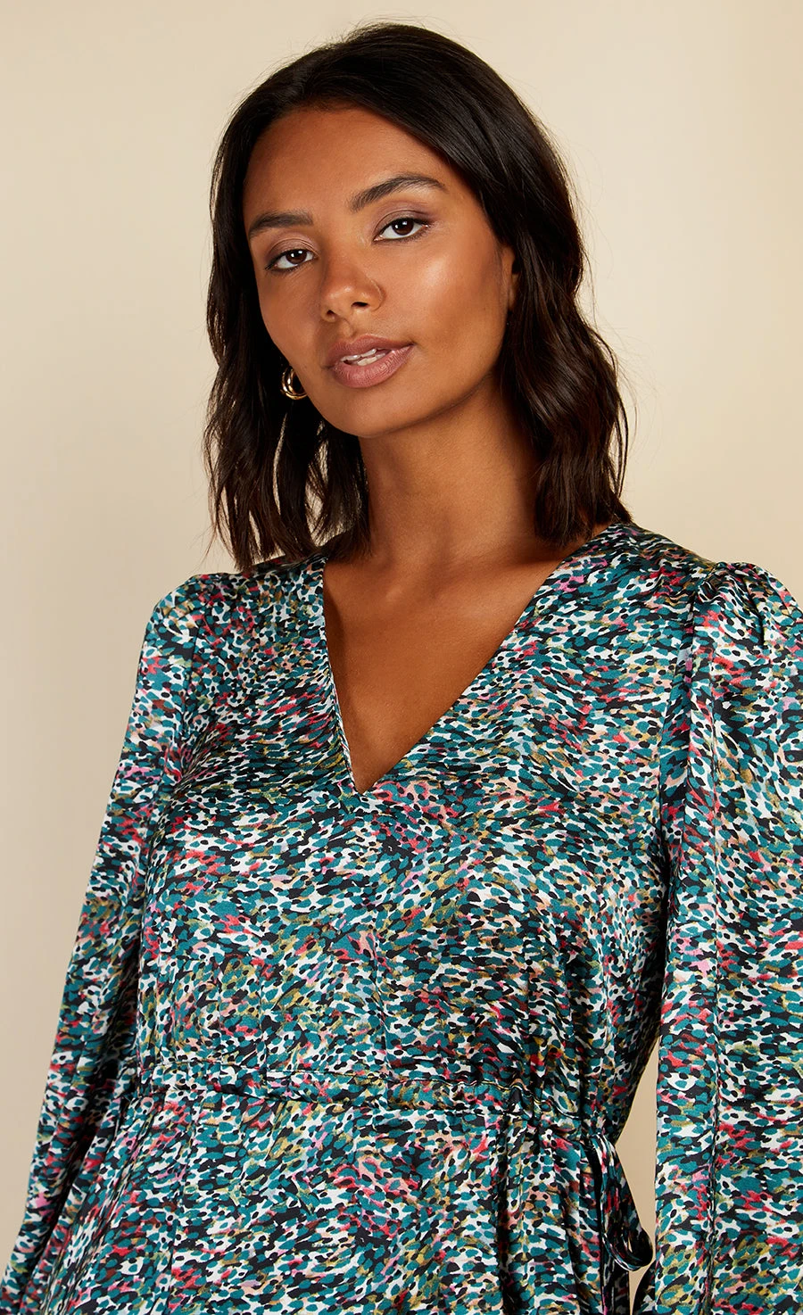 Our go-to for day dressing, crafted in a printed satin and featuring a V-neck and tie-waist detail, this is a throw on and go wardrobe winner, just add boots or trainers. Print placement may vary.