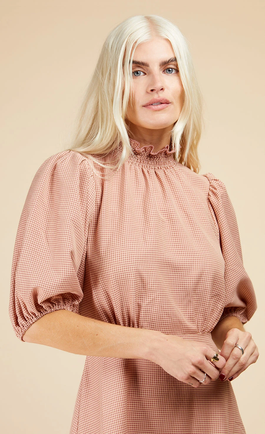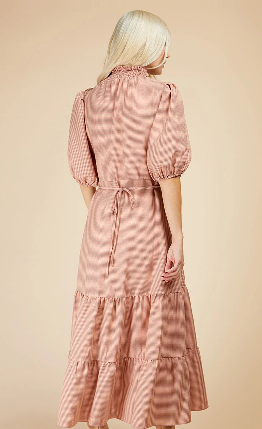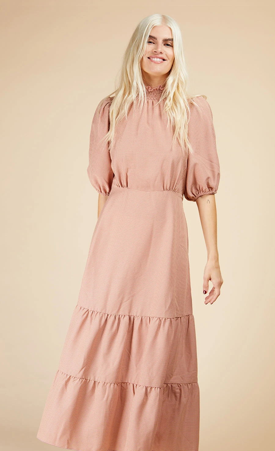 Your spring wardrobe starts with our gingham midi dress. That print may be cute, but the high neck, puff sleeves and tiered hem add a whopping dose of chic. Cut in a form-fitting shape, the under-the-bust seam accentuates the smallest part of your body for a feel-good fit.