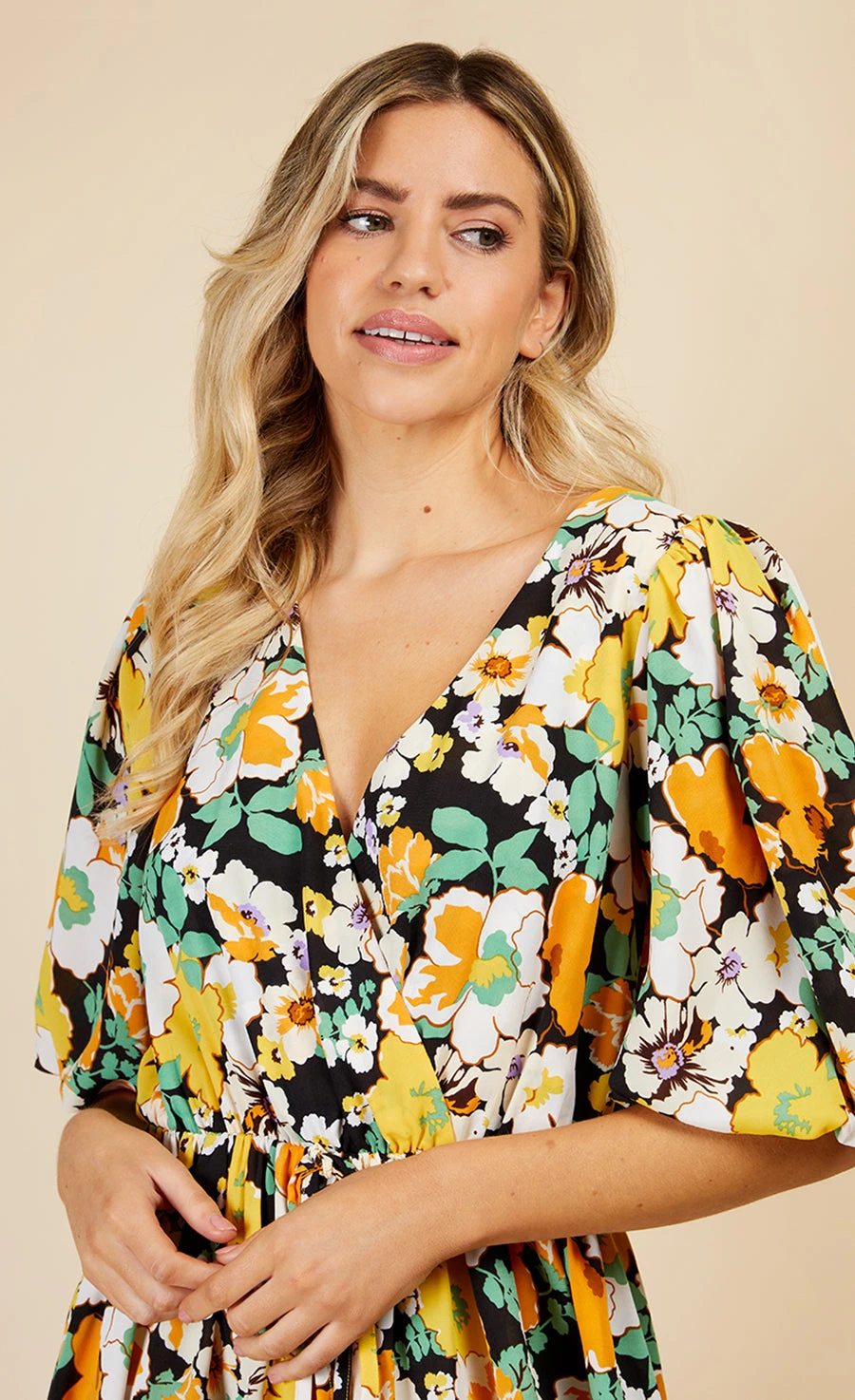 The secret to effortless warm-weather dressing? A cute playsuit blooming with bold vintage-inspired florals. Framed by dreamy puff sleeves, it’s belted at the waist to highlight your silhouette – just add wedges.