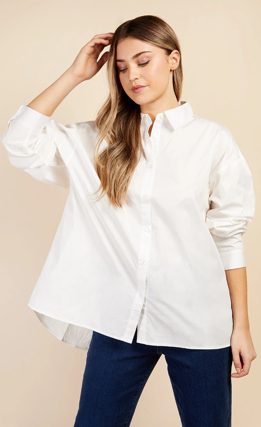 The classic white shirt just got a little more fun. A split back design ups the anti on this timeless wardrobe staple. Designed in an oversized silhouette complete with balloon sleeves and longline length. Pair with jeans and a biker boot for the ultimate in off-duty chic.