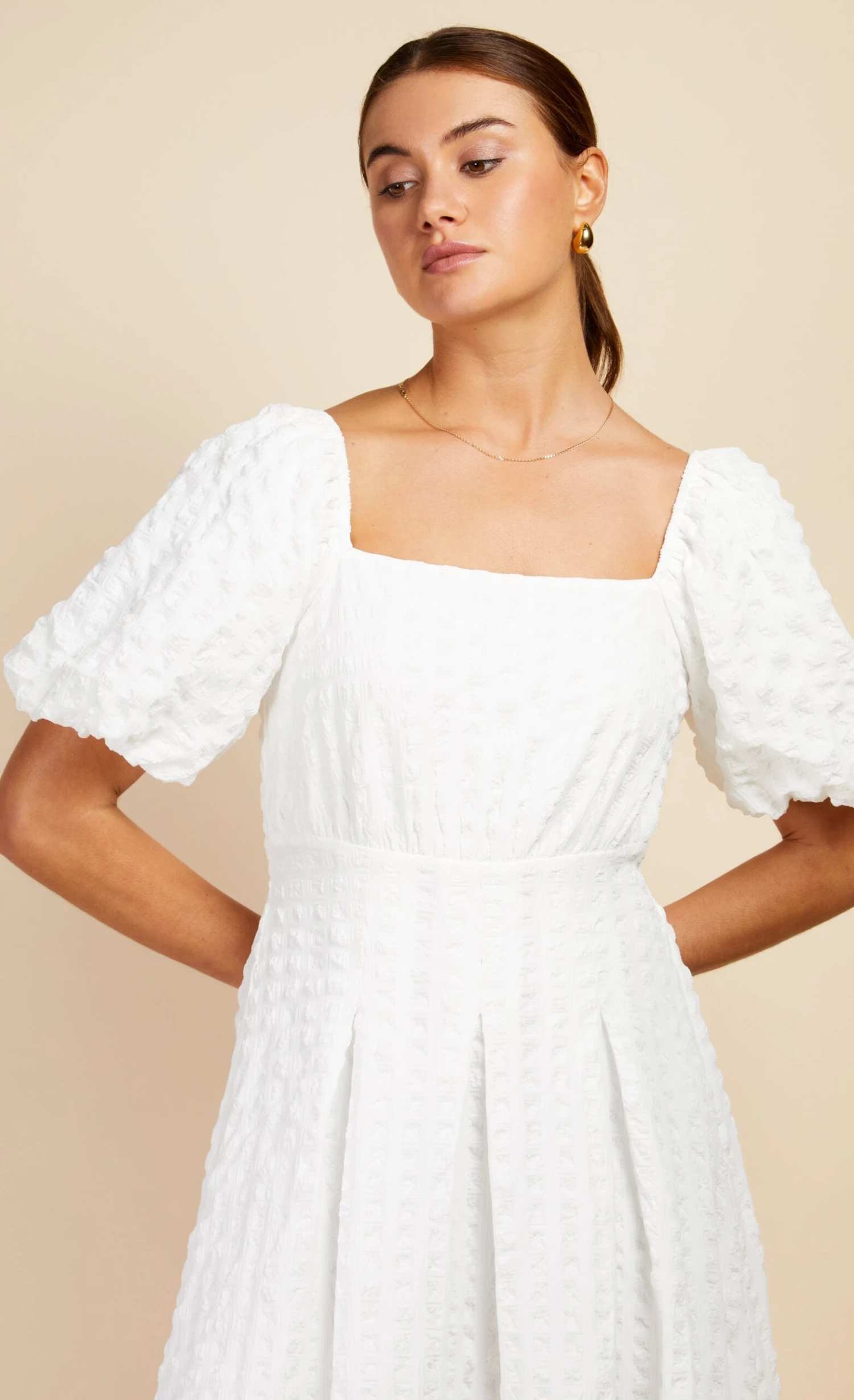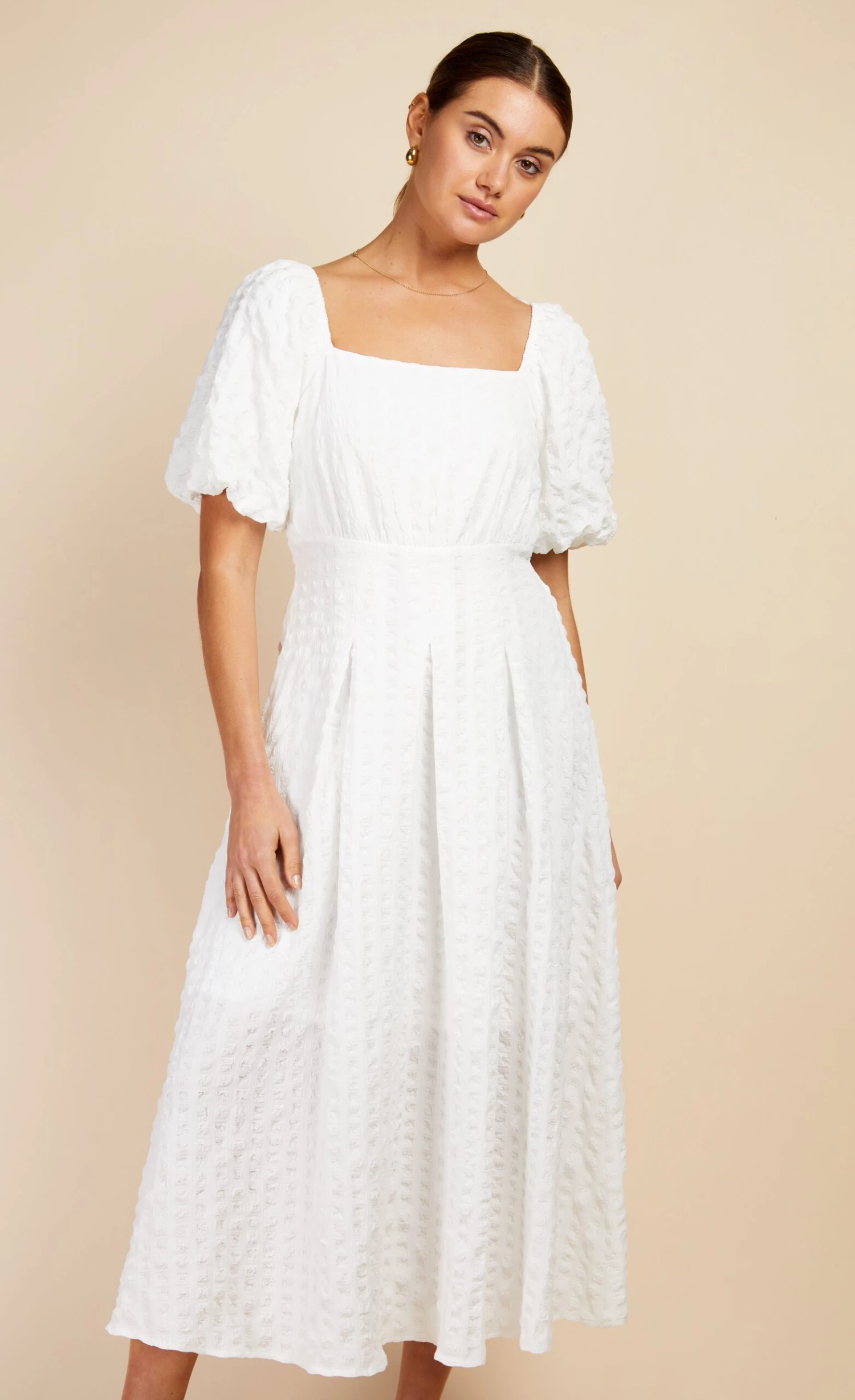 Crafted with a charming waffle texture, this midaxi dress combines comfort with contemporary style. A square neckline adds a touch of sophistication, while the A-line silhouette provides a flattering fit. Pair with metallic barely there heels and statement earrings.
